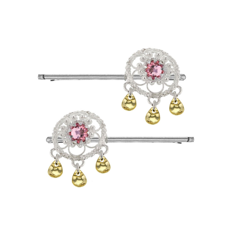 Denne hårnålen kombinerer det feminine og tidløse på en harmonisk måte, og passer perfekt til oppsatte frisyrer eller som en dekorativ detalj i løst hår. Den dype rosatonen i krystallen gir et sofistikert og varmt uttrykk – ideell både til hverdags og spesielle anledninger.