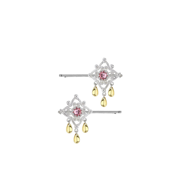 Denne hårnålen kombinerer det feminine og stilrene på en perfekt måte, og passer like godt til oppsatte frisyrer som til å holde håret lett på plass. Den lyserosa krystallen gir et subtilt glimt av farge, og gjør hårpynten til et nydelig blikkfang – enten du bruker den til fest, hverdag eller spesielle anledninger.