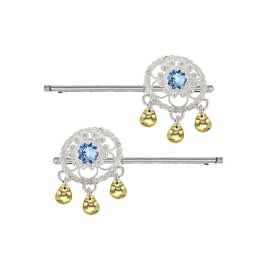 Løft frisyren med denne elegante hårnålen fra Hasla, laget i ekte 925 sølv og dekorert med en glitrende lyseblå krystall. Hårpynten har en vakker blomsterform, med en detaljert gullfarget løvform hengende ned, som tilfører både bevegelse og et hint av naturinspirert eleganse.