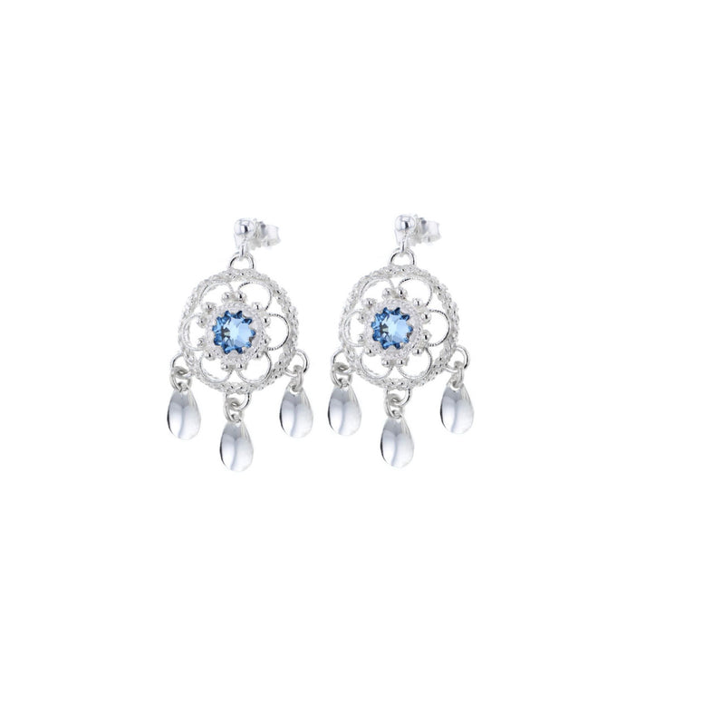 Øredobbene er laget i ekte 925 sølv og har en detaljrik utførelse med en nydelig lyseblå krystall som midtpunkt. Blomsterdesignet med hengende løv gir et naturlig, men samtidig moderne uttrykk – akkurat slik Hasla er kjent for.
