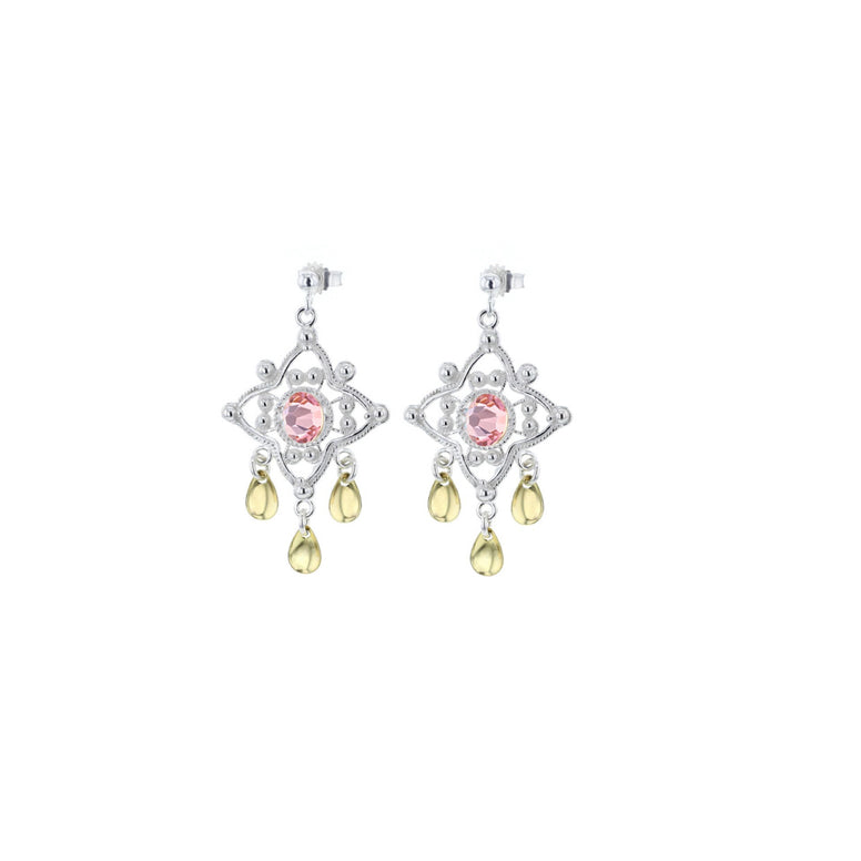 Disse vakre øredobbene fra Hasla har en stjerneform med én lyserosa krystall i hver ørepynt, og dekorative gull-løv som henger ned. De er laget i ekte 925 sølv og holder høy kvalitet, perfekt både til hverdag og fest. Finnes matchende ring for et komplett sett.
