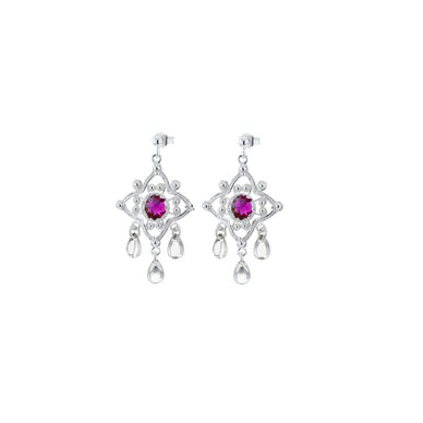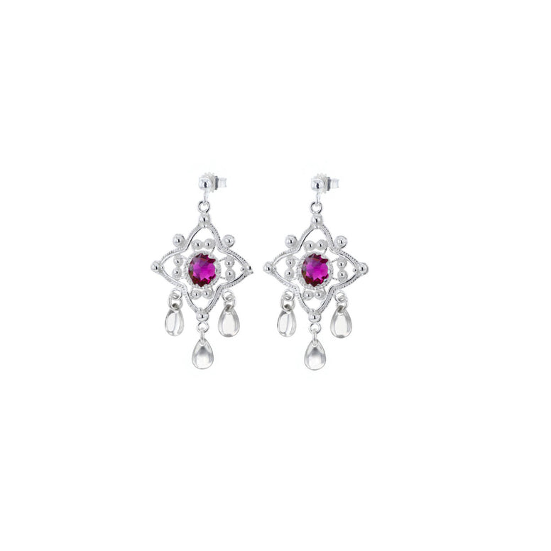 Disse vakre øredobbene fra Hasla har en stjerneform med én mørkerosa krystall i hver ørepynt, og dekorative sølv-løv som henger ned. De er laget i ekte 925 sølv og holder høy kvalitet, perfekt både til hverdag og fest. Finnes matchende ring for et komplett sett.