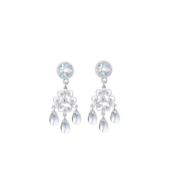Disse vakre øredobbene fra Hasla har en elegant blomsterform med én nordlys krystall i hver ørepynt, som endrer farge etter lyset. De er laget i ekte 925 sølv og holder høy kvalitet, perfekt både til hverdag og fest. Finnes matchende ring for et komplett sett.