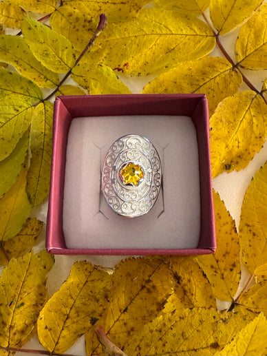 Denne ringen fra Hasla har en elegant, oval form med én stor gul krystall sten. Den er laget i ekte 925 sølv og holder høy kvalitet, perfekt både til hverdag og fest.