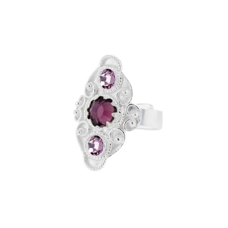 Denne ringen fra Hasla har en elegant, langstrakt form med levendel og lilla krystaller. Den er laget i ekte 925 sølv og holder høy kvalitet, perfekt både til hverdag og fest. Matchende øredobber finnes for et komplett sett.