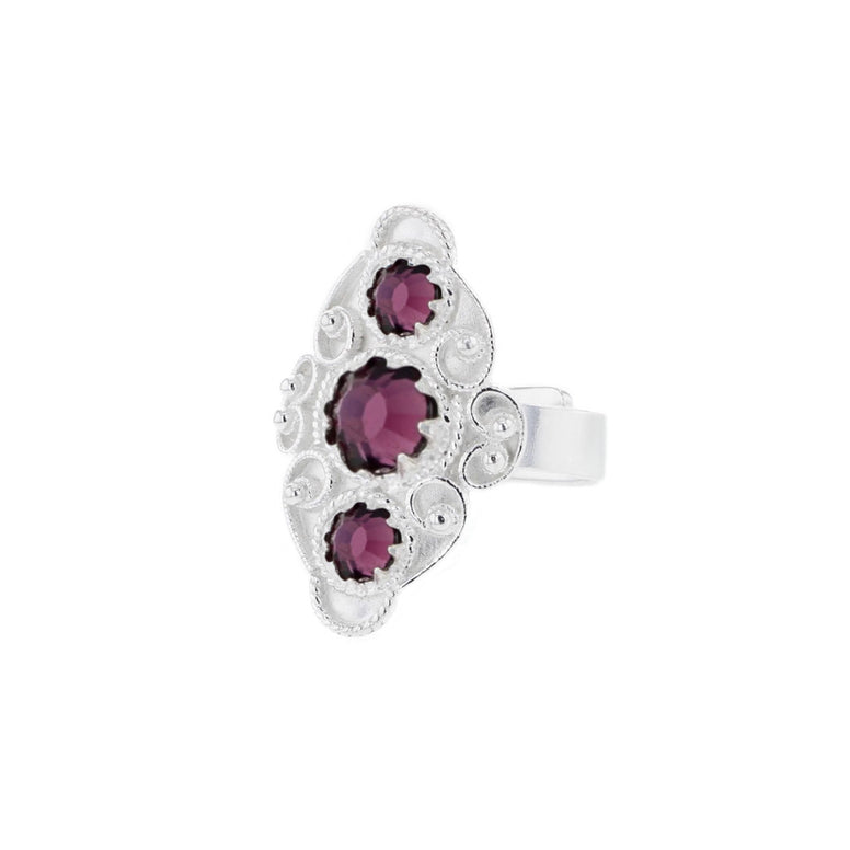 Denne ringen fra Hasla har en elegant, langstrakt form med lilla krystaller. Den er laget i ekte 925 sølv og holder høy kvalitet, perfekt både til hverdag og fest. Matchende øredobber finnes for et komplett sett.