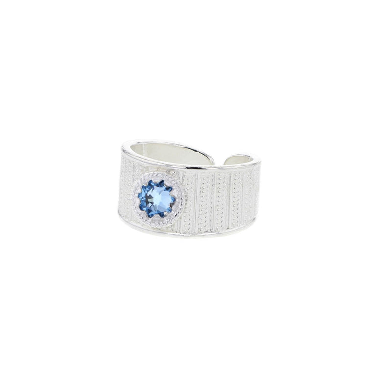 Denne ringen fra Hasla har et elegant og moderne uttrykk med én stor lyseblå, skinnende krystall som midtpunkt. Det langstrakte designet gir ringen et tidløst og sofistikert preg, perfekt for deg som liker et stilrent uttrykk med et hint av luksus.