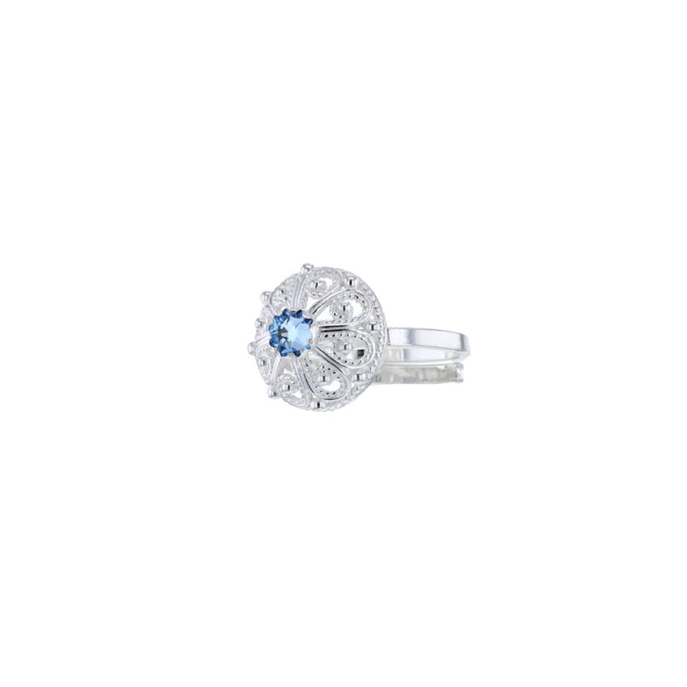 Denne ringen fra Hasla har en vakker form med én lyseblå krystall. Den er laget i ekte 925 sølv og holder høy kvalitet, perfekt både til hverdag og fest. Matchende øredobber finnes for et komplett sett.