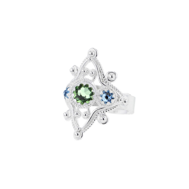 Denne ringen fra Hasla har en vakker stjerneform med lyseblå og lysegrønn krystallsten. Den er laget i ekte 925 sølv og holder høy kvalitet, perfekt både til hverdag og fest. Matchende øredobber finnes for et komplett sett.