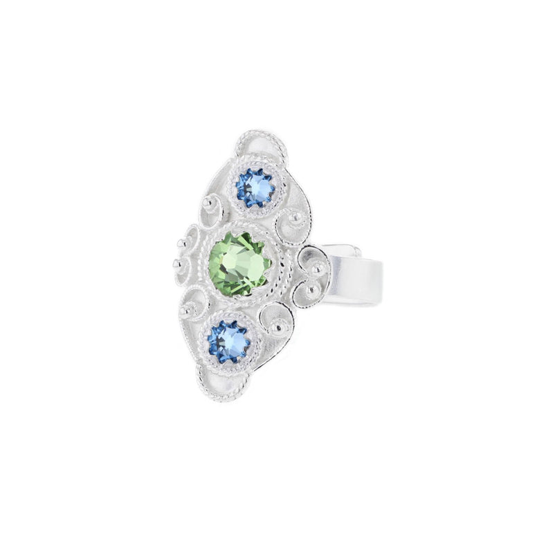Denne ringen fra Hasla har en elegant, langstrakt form med lyseblå og lysegrønn krystaller. Den er laget i ekte 925 sølv og holder høy kvalitet, perfekt både til hverdag og fest. Matchende øredobber finnes for et komplett sett.