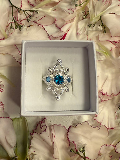 Denne ringen fra Hasla har en vakker stjerneform med lyseblå og turkis krystallsten. Den er laget i ekte 925 sølv og holder høy kvalitet, perfekt både til hverdag og fest. Matchende øredobber finnes for et komplett sett.