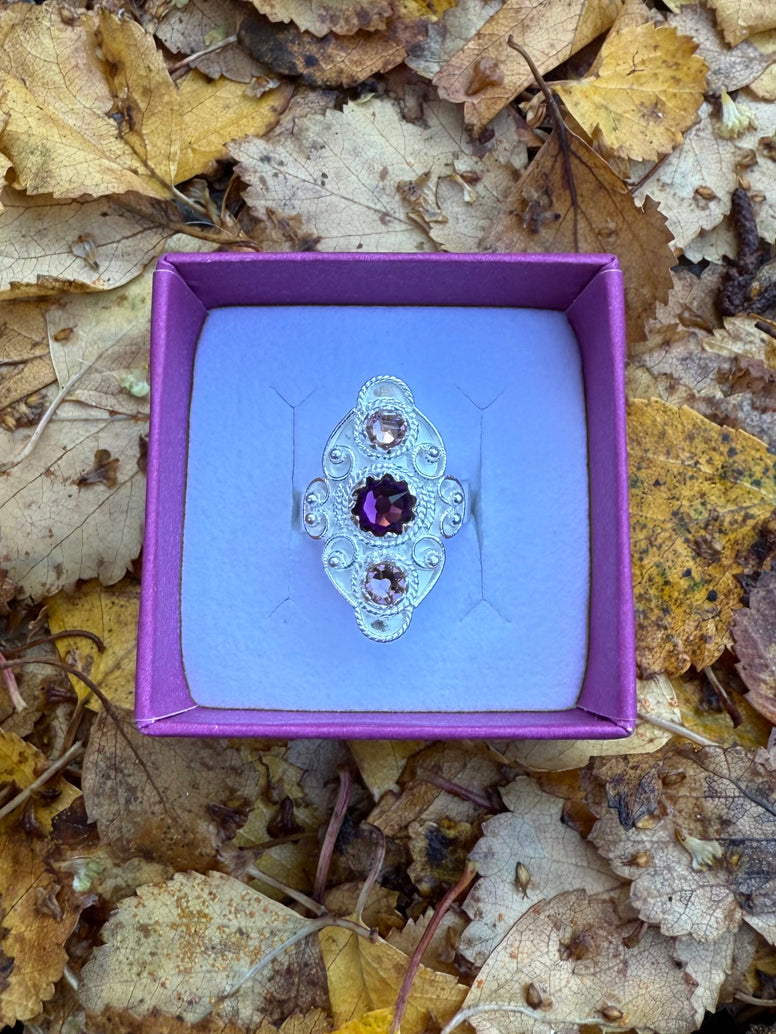 Denne ringen fra Hasla har en elegant, langstrakt form med lyserosa og lilla krystaller, som endrer farge etter lyset. Den er laget i ekte 925 sølv og holder høy kvalitet, perfekt både til hverdag og fest. Matchende øredobber finnes for et komplett sett.