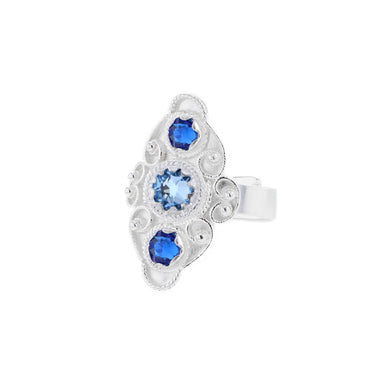 Denne ringen fra Hasla har en elegant, langstrakt form med mørkeblå og lyseblå krystaller. Den er laget i ekte 925 sølv og holder høy kvalitet, perfekt både til hverdag og fest. Matchende øredobber finnes for et komplett sett.