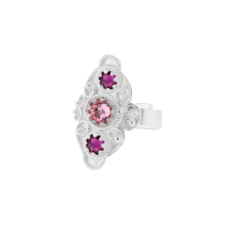 Denne ringen fra Hasla har en elegant, langstrakt form med mørkerosa og lyserosa krystaller. Den er laget i ekte 925 sølv og holder høy kvalitet, perfekt både til hverdag og fest. Matchende øredobber finnes for et komplett sett.