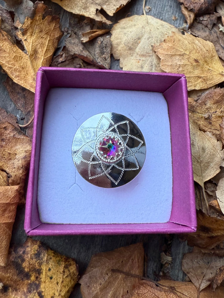 Denne ringen fra Hasla har en rund form med en vakker inngravert blomst, dekorert med en glitrende nordlyssten. Den er laget i ekte 925 sølv og holder høy kvalitet, perfekt både til hverdag og fest.