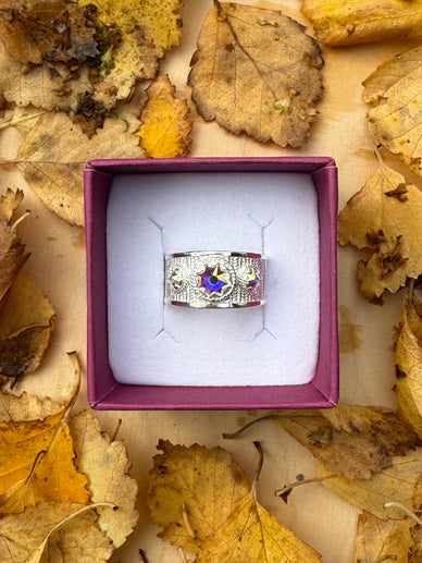 Denne ringen fra Hasla har et elegant og moderne uttrykk med tre krystaller i nordlys-farge, som skifter nyanse etter lyset. Den er laget i ekte 925 sølv og holder høy kvalitet – et smykke som passer like godt til hverdagsbruk som til festlige anledninger.