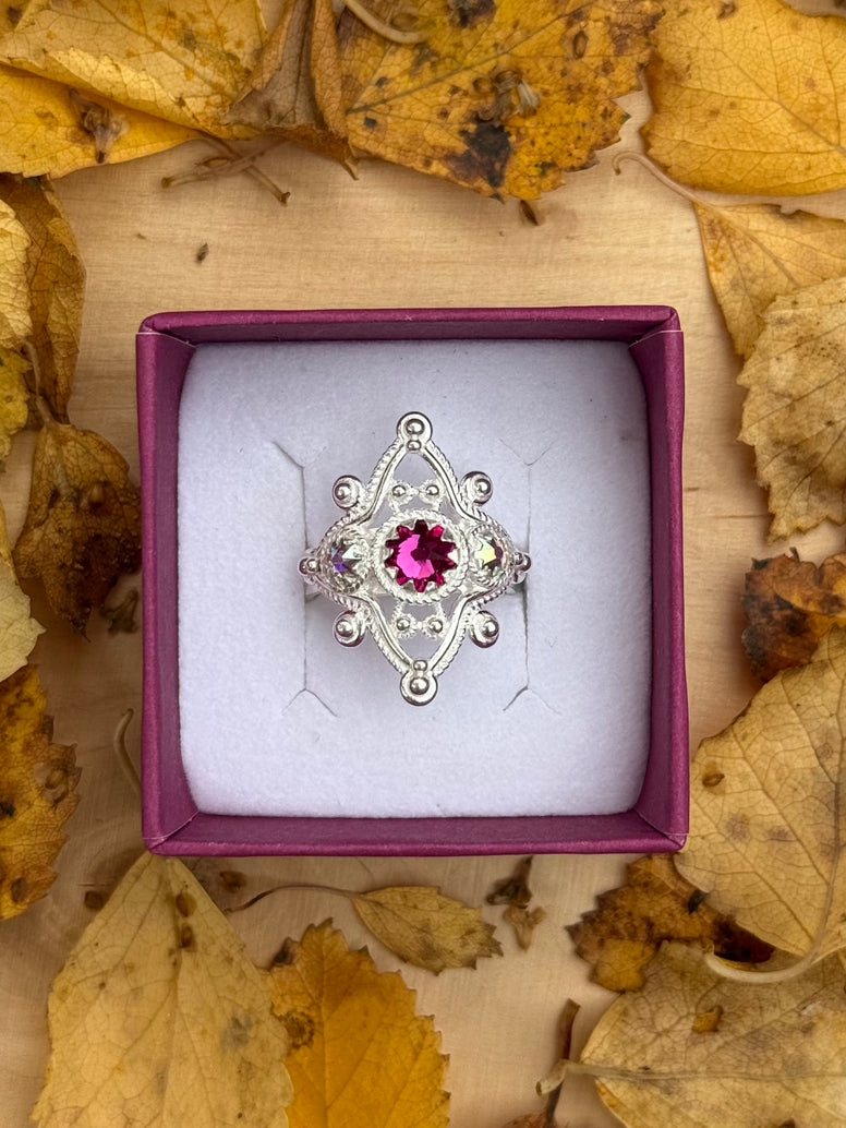 Denne ringen fra Hasla har en vakker stjerneform med nordlys og mørkerosa krystallsten. Den er laget i ekte 925 sølv og holder høy kvalitet, perfekt både til hverdag og fest. Matchende øredobber finnes for et komplett sett.