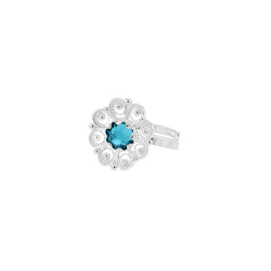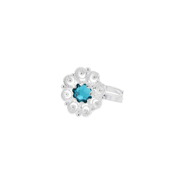 Denne ringen fra Hasla har en vakker blomsterform med én krystall i turkis. Den er laget i ekte 925 sølv og holder høy kvalitet, perfekt både til hverdag og fest. Matchende øredobber finnes for et komplett sett.