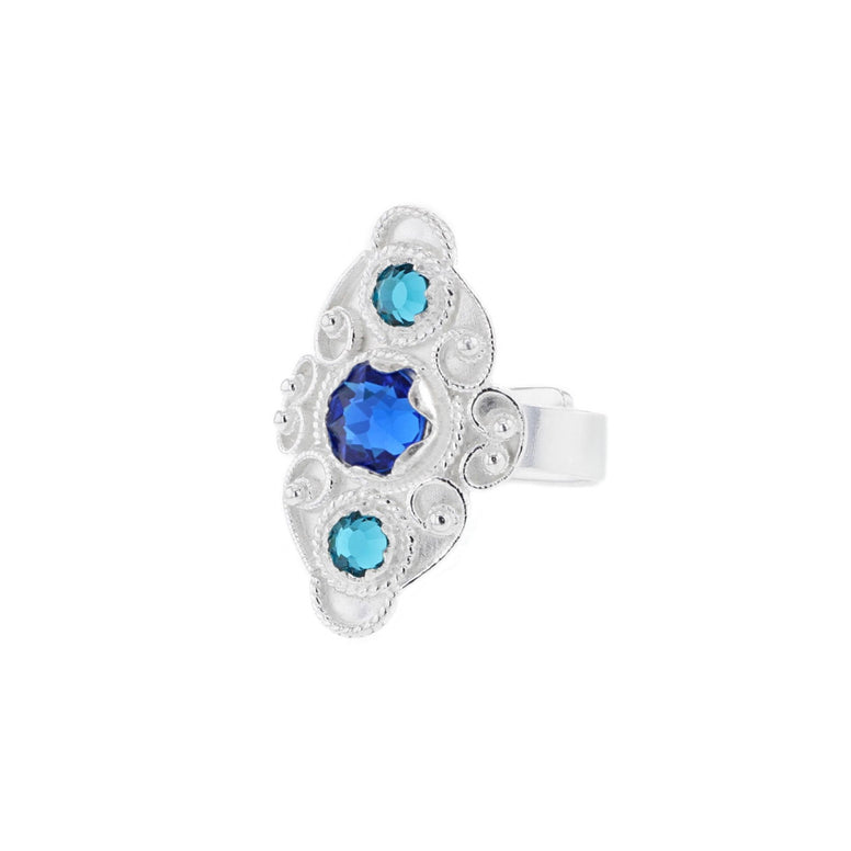 Denne ringen fra Hasla har en elegant, langstrakt form med turkis og mørkeblå krystaller. Den er laget i ekte 925 sølv og holder høy kvalitet, perfekt både til hverdag og fest. Matchende øredobber finnes for et komplett sett.
