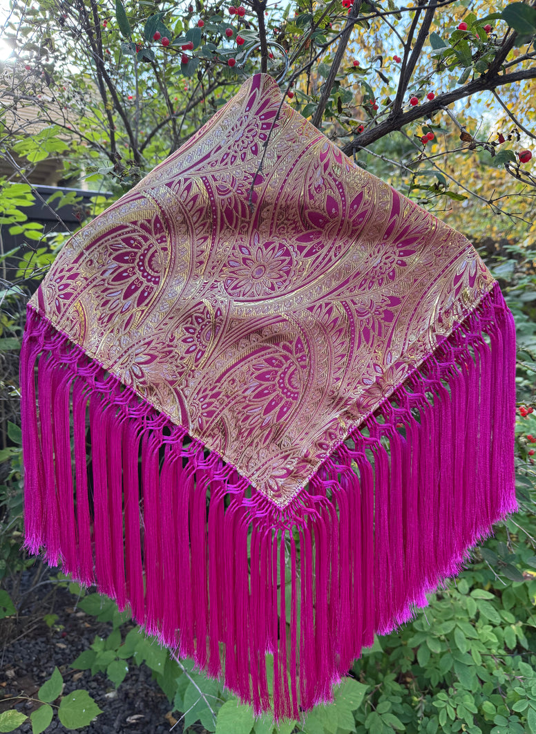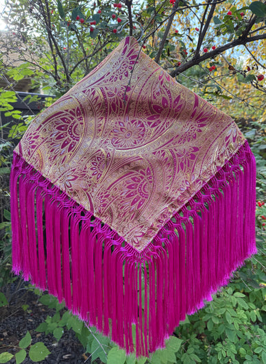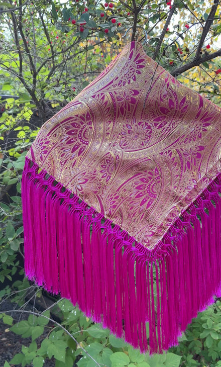 Vakkert silkesjal i mørkerosa med gull detaljer til salgs. Alle knuter er limt 2 ganger for best holdbarhet og kvalitet.