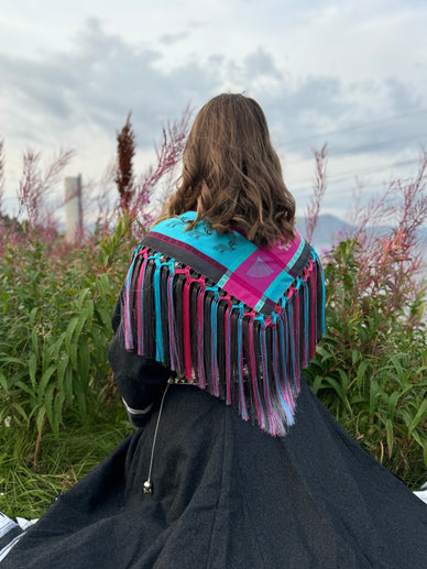 SILKESJAL by TEKZINE Et av mine første koftesjal jeg frynset. Dette sorte sjalet med rosa og lyseblå detaljer passet perfekt til kundens Alta kofte.