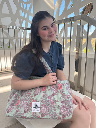 Denne elegante totebagen er kviltet i 100 % bomull. Den kombinerer både stil, funksjonalitet og kvalitet. Med sitt friske design i lysegrønn/turkis med rosa blomsterdetaljer, er den både et praktisk og trendy valg til hverdagen.