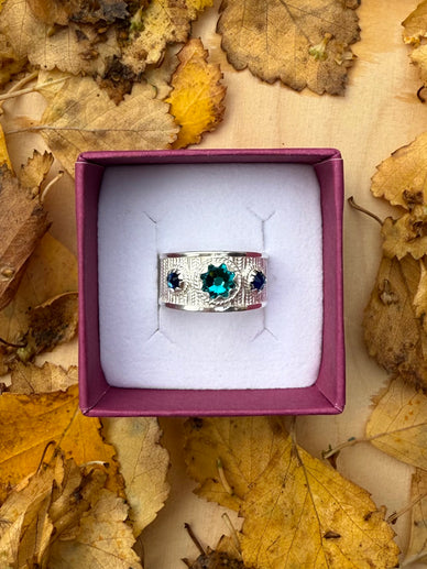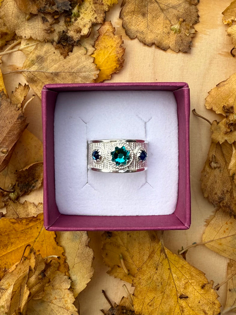Denne ringen fra Hasla har et elegant og moderne uttrykk med tre krystaller i mørkeblå og turkis. Den er laget i ekte 925 sølv og holder høy kvalitet – et smykke som passer like godt til hverdagsbruk som til festlige anledninger.